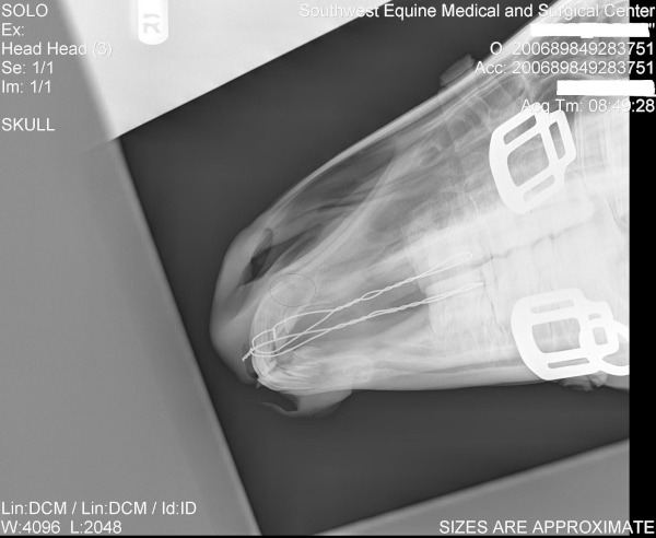 Upon arrival to Southwest Equine, Jawbreaker and the mare were both a little groggy since they had been sedated for the trailer ride. Oral evaluation revealed that the incisive bone was visibly fractured. It was also noted that large portions of the hard palate and other surrounding soft tissues were reflected away from the boney margins. Radiographs (X-Rays) were taken to determine the extent of the fracture. Radiographs showed that the fracture was complete (all the way through the bone), but did not indicate that any other fractures were present. The owners elected for surgical correction of the fracture at that time.