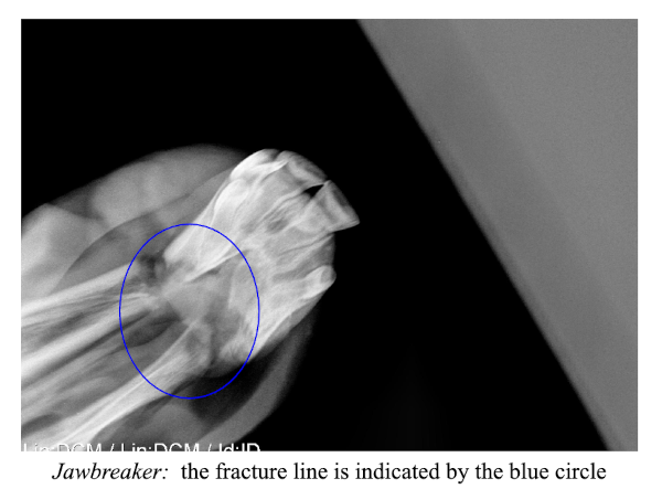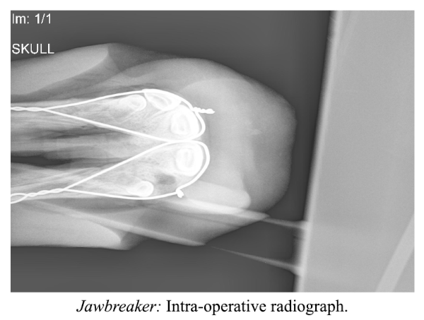 Four weeks after surgery, radiographs were repeated of Jawbreaker’s fracture. These radiographs showed that the fracture line was remodeling, however still visible and that the fixation wires were still intact. At that time it was recommended to recheck in one month to re-asses the fracture.