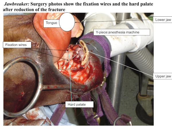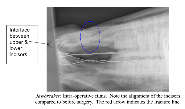 Jawbreaker was prepared for surgery and the mare was sedated and placed in a stall while he was in surgery. During surgery, the fracture and soft tissue wounds were cleaned of all dirt and debris. The fracture was reduced (ie the bones were put back in a normal position) and the incisors were aligned, fixation wires were placed to hold the bones in their proper place. “Wiring” was performed by drilling between the upper 2nd and 3rd premolar teeth on both sides to allow for placement of an 18 gauge wire. These wires were then brought forward and were guided through the gums on midline, just above the incisors. The wires were manually tightened to provide fracture stability. The soft tissues were then sutured together to regain normal oral anatomy. The fixation wires were then coated with methylmethacrylate to further enhance their strength. Jawbreaker recovered from surgery uneventfully.